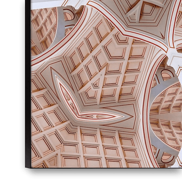 Un motif fascinant qui se distingue par sa structure symétrique et riche en détails. Il s'agit d'une représentation abstraite de la voûte d'un plafond d'un motif architectural où les formes géométriques occupent une place centrale. Les motifs principaux du tableau sont des surfaces en forme de losange et de rectangle, dans des tons…