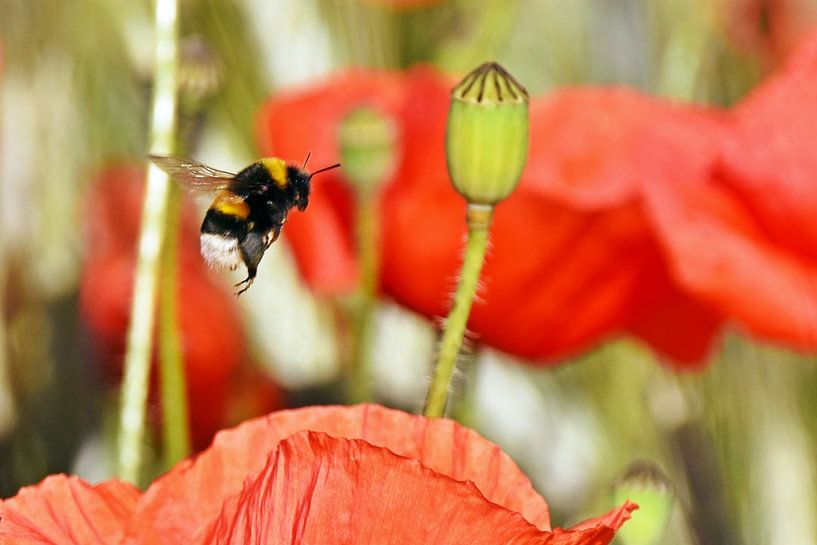 Achetez cette œuvre d'art florale un bourdon dans un champ de coquelicots par Werner Lehmann sur toile, aluminium, ArtFrame ou photographie (encadrée), impression d'art en haute qualité et tout format.
