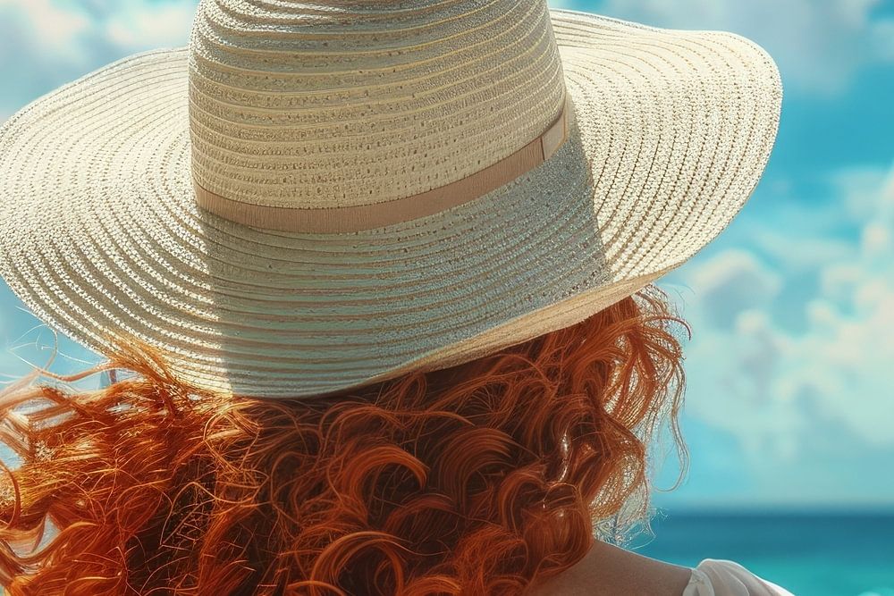 Femme aux longs cheveux bouclés roux et au chapeau, vue de dos, debout sur la plage, regardant vers la mer. Image romantique et pittoresque d'une jeune femme plongée dans ses pensées. Il s'agit d'une image numérique qui n'a pas été prise avec un véritable appareil photo.