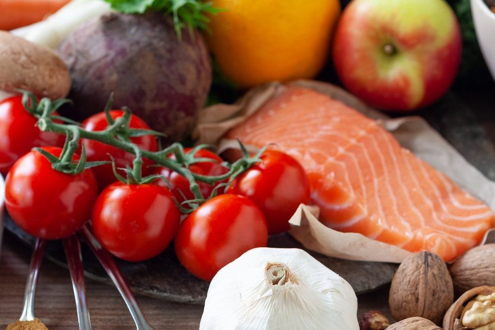 Des légumes frais et colorés, du poisson, des légumineuses, des noix, des céréales sont disposés de manière appétissante sur un plateau en bois. L'image symbolise une alimentation saine et équilibrée et attire visuellement l'attention dans chaque cuisine.