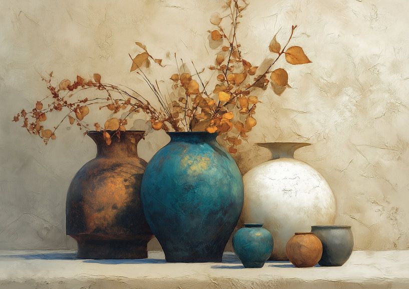 vases fleurs | Blue Vessel - Cette peinture florale représente une nature morte Japandi avec de grands vases ronds en céramique et des fleurs séchées brun doré dans une texture douce semblable à de la peinture, une peinture florale moderne et une peinture de fleurs avec une nature morte avec des vases qui s'intègre parfaitement dans un…