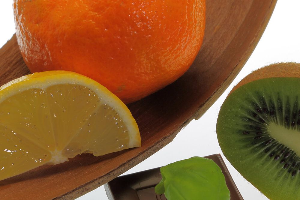 Stilleven van vers fruit, mandarijn, kiwi en citroen