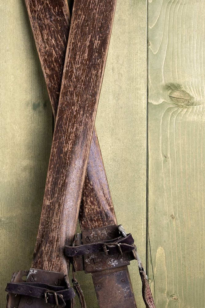 vieux skis en bois avec fixation par sangle devant le mur en bois