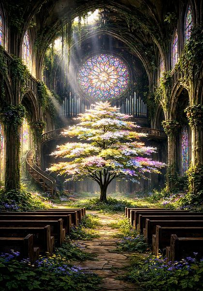 La photo montre une église de style gothique, comme sortie d'un conte de fées, que la nature a reconquise. La lumière chaude du soleil pénètre dans la pièce à travers de hauts vitraux colorés, créant un jeu d'ombres et de lumières aux couleurs chatoyantes. Au centre se dresse un grand arbre en fleurs dont les branches s'étendent comme…