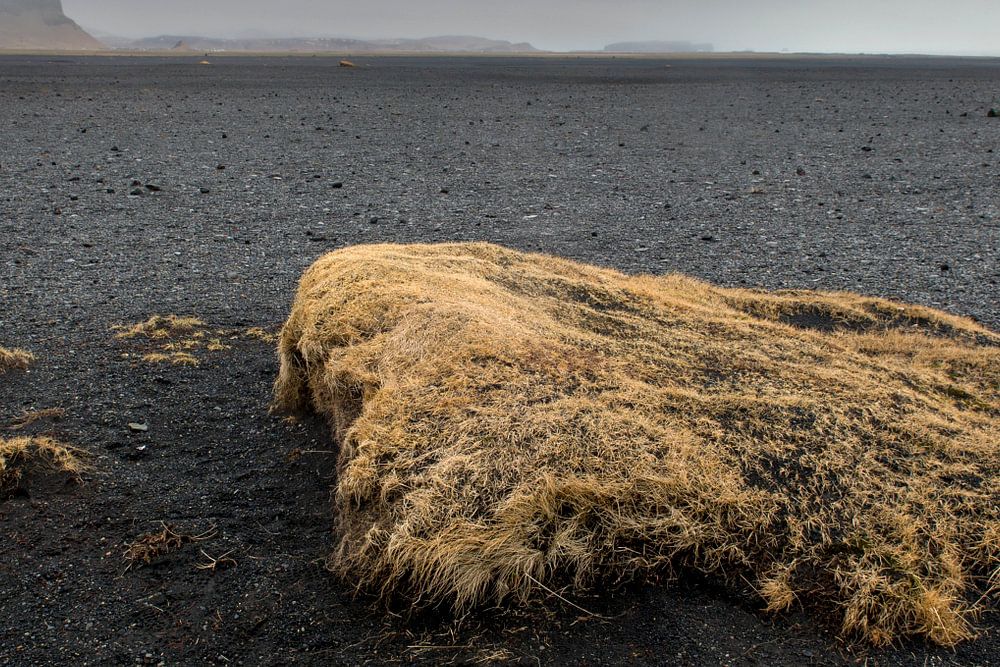 vlakte in Ijsland met zwart zand en met mos begroeide steen