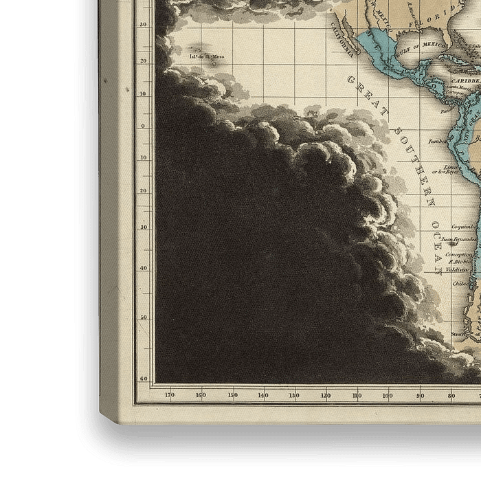 La carte dépliante montre des nuages autour des bords extérieurs de la carte décrivant le monde connu depuis la découverte de l'Amérique, en 1498, jusqu'à la mort de Charles V d'Allemagne, en 1551. Dix-septième période. L'Amérique du Sud et les parties orientale et méridionale de l'Amérique du Nord ont été dégagées des nuages. Les Philippines sont également visibles.