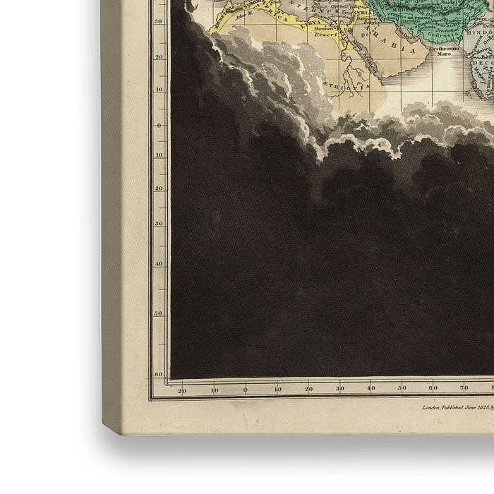 Nuages s'éloignant pour montrer la terre connue depuis la fin de la troisième guerre punique, 146 avant J.-C., jusqu'à la naissance du Christ. (de 3853 à 4004 A.M.). Huitième période. En couleur, s'étendant de l'Irlande et du Maroc à la Chine. L'Empire romain est représenté en jaune, l'Empire parthe en vert, l'Hindoostan en gris et la Chine en marron clair.