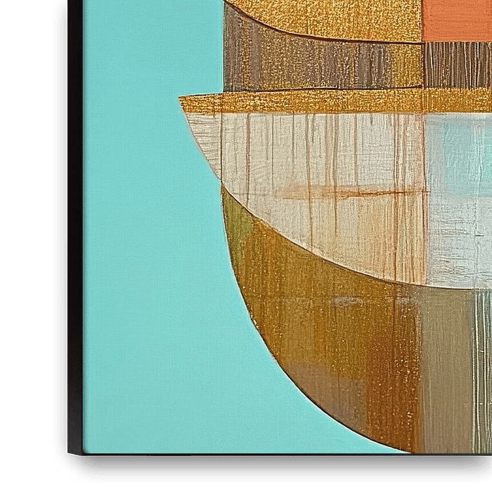 Abstrait or - Miroirs dorés - Cette peinture abstraite présente une composition stylisée et stratifiée de formes géométriques en or, orange et bleu, qui suggèrent ensemble une mer réfléchissante et un soleil doré.