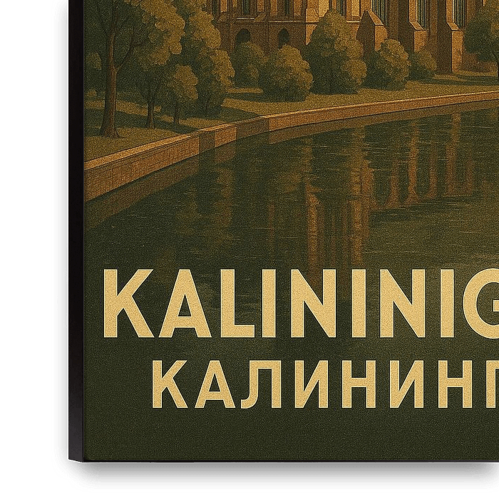 Entrez dans un monde où l'histoire gothique allemande rencontre l'héritage russe avec cette affiche atmosphérique de Kaliningrad (anciennement Königsberg). L'œuvre d'art se concentre sur l'emblématique cathédrale de Königsberg, située sur l'île de Kant. La structure gothique en briques rouges est représentée avec son imposante flèche et…