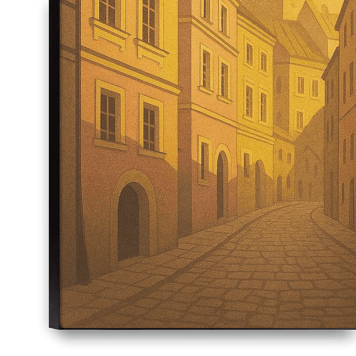 Promenez-vous dans les rues sinueuses et ensoleillées de l'est de la Pologne avec cette affiche de Lublin. L'œuvre d'art présente une charmante perspective sur une étroite rue pavée de la vieille ville, menant le regard vers l'emblématique porte de Cracovie et la tour blanche du château de Lublin au loin. L'architecture est baignée…