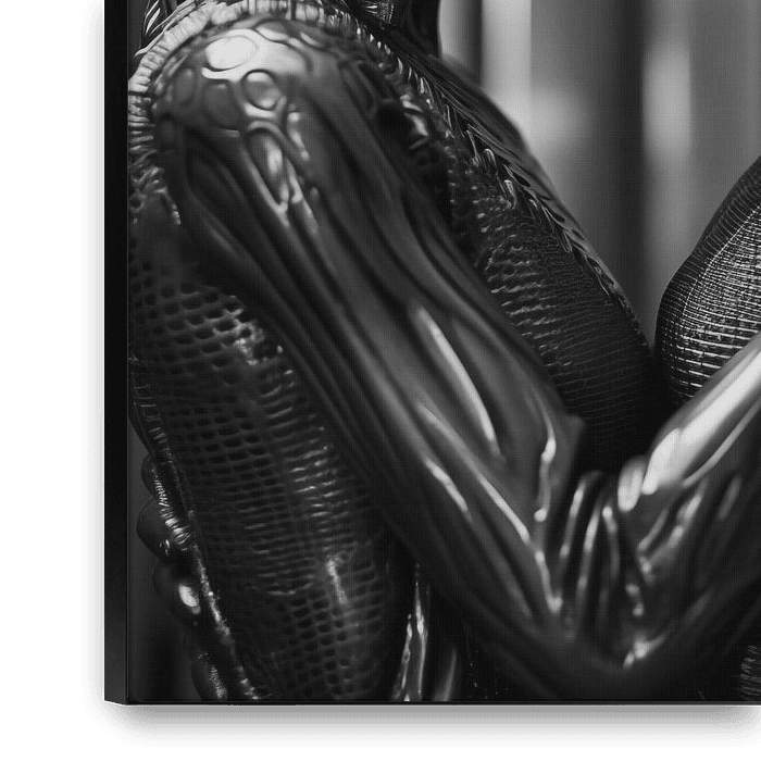 L'amour est un sentiment complexe et multidimensionnel qui englobe différents aspects tels que l'affection, l'attirance, l'attachement, la confiance, le respect, les soins, le dévouement et bien plus encore. L'amour peut se développer entre des personnes de sexes, de cultures, de religions ou de races différentes. Un alien est un être qui n'est pas originaire de la Terre, mais d'une autre planète, d'une autre galaxie ou d'une autre dimension. Un alien peut toutefois avoir une forme, une couleur, une taille, une structure, une intelligence, une langue, une culture, une morale ou une religion totalement différentes de celles d'un être humain. La communication et l'interaction entre un humain et un alien peuvent donc être un défi de taille, qui demande beaucoup de patience, d'ouverture, de curiosité et de respect. C'est exactement ce que j'ai voulu montrer avec cette photo en noir et blanc d'un alien et d'un mannequin blond qui s'enlacent et s'embrassent.