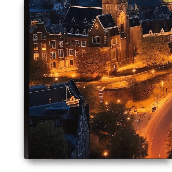 Amsterdam, vue d'une grande hauteur à l'heure bleue, enchante par sa splendeur sereine. Un voile de lumière d'un bleu profond enveloppe la ville, entre le jour et la nuit. Les canaux illuminés traversent la ville comme des veines d'or, se reflétant dans les eaux calmes. Les ponts emblématiques et les bâtiments historiques se détachent…