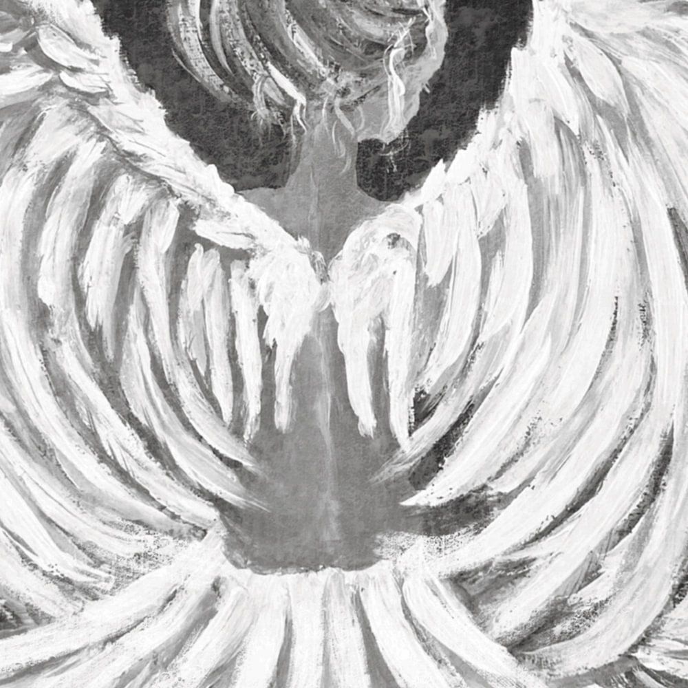 Une gracieuse figure angélique aux grandes ailes blanches est représentée de dos, sur un fond sombre. Les lignes douces et fluides des ailes et de la robe créent une atmosphère éthérée et paisible. Cette œuvre a été peinte à l'origine avec de la craie pastel et de la peinture acrylique noire et blanche sur un plateau en bois vieilli, par Krista Kitsz. Un art élégant et unique dans des tons monochromes de gris. Inspiré par les histoires de beaux anges combinées à la beauté féminine et à la simplicité de l'art en nuances de gris.