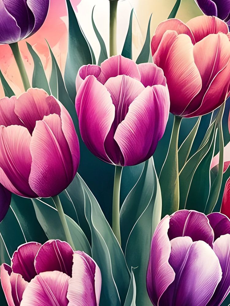 Une aquarelle vibrante qui capture la beauté délicate d'un bouquet de tulipes. Des feuilles vertes luxuriantes entourent les fleurs, qui présentent un étonnant dégradé de mauves et de roses. Des éclaboussures de couleurs douces et diffuses à l'arrière-plan rehaussent la composition florale, créant une esthétique élégante et rêveuse.