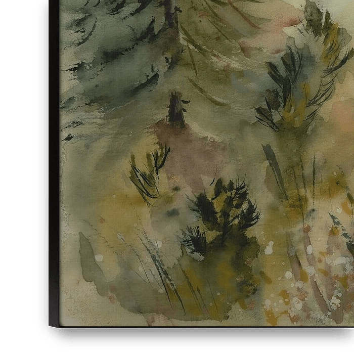 Auarel ou aquarelle d'un paysage de la Veluwe au lever du soleil. On aperçoit un sentier entre les grands et les petits conifères.