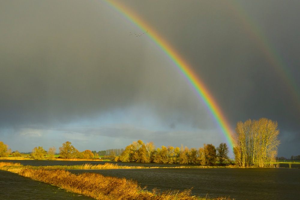 Arc-en-ciel lors d'une averse d'automne sur la rivière IJssel près de Zwolle en Overijssel, Pays-Bas. Les roseaux et les arbres au premier plan sont très éclairés tandis que le ciel à l'arrière-plan est sombre.