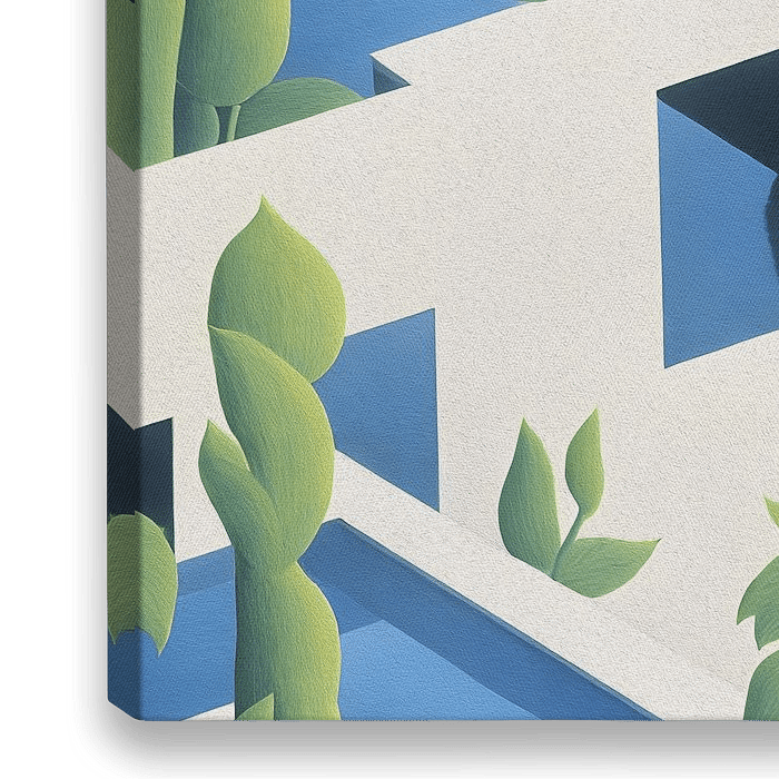 Cette peinture abstraite combine une architecture étrange avec les formes organiques de plantes et de grandes fleurs. Les formes organiques et les plantes semblent pour ainsi dire sortir des éléments architecturaux et confèrent à la scène un caractère vivant et dynamique. Cependant, les plantes et les fleurs ne sont pas rendues de…