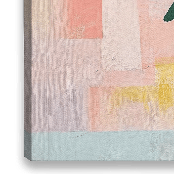 Art floral | Vase de fleurs pastel - Cette peinture de fleurs représente un vase coloré avec diverses fleurs et feuilles, exprimées dans un mélange vibrant de couleurs pastel, sur un fond de plans abstraits et géométriques dans des tons doux.