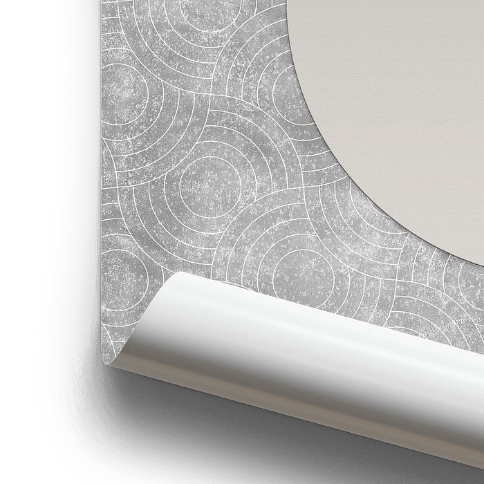 Palette de couleurs neutres gris clair et blanc, formes géométriques simples.