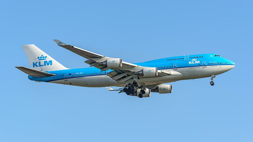 Le Boeing 747-400 de KLM, PH-BFI, portant le nom de City of Jakarta, est sur le point d'atterrir à l'aéroport de Schiphol.