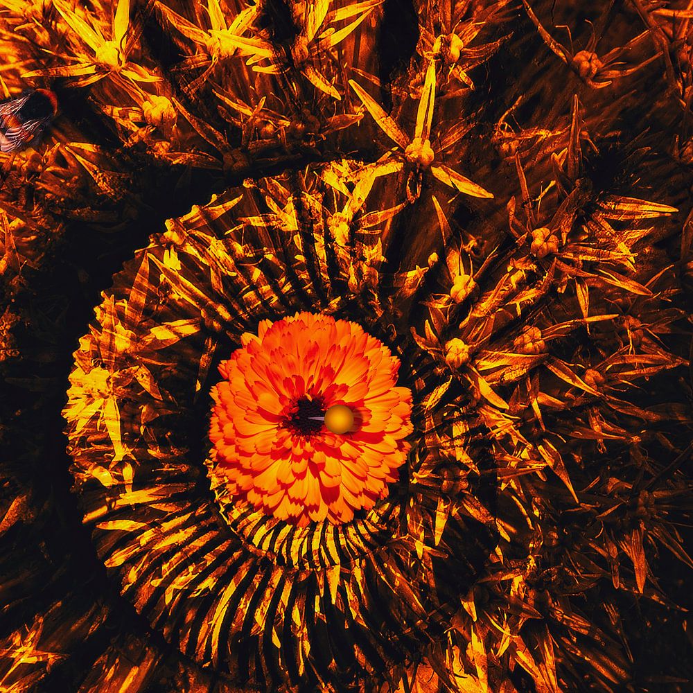 Au milieu de cette fleur spéciale, vous trouverez un gerbera orange. La grande fleur a la forme d'une ammonite. Cela donne à l'ensemble un caractère surréaliste. Les couleurs chaudes font le reste.