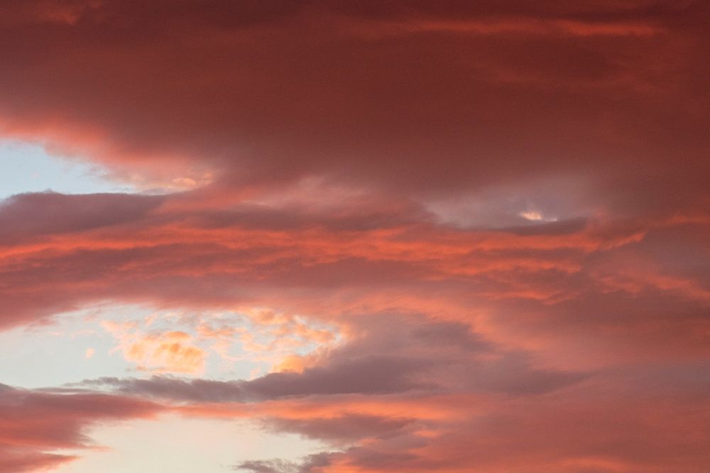 De hemel kleurde rood, geel en paars. Ademloos hebben we een uur staan kijken naar de zonsondergang aan de westkust van Ierland. Deze felle kleurenpracht recht voor ons boven de zee en boven land gedemptere tinten roze, blauw en paars. Een feest voor het oog. Tussen de bewolking nog een paar stukjes blauwe lucht.