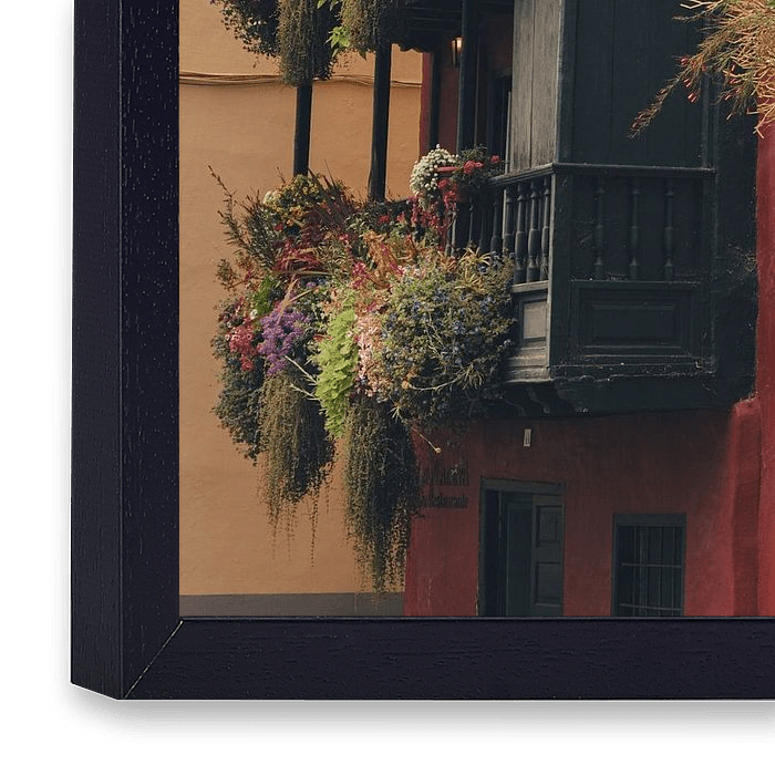 Cette image montre les célèbres balcons en bois traditionnels des îles Canaries, décorés d'une profusion de fleurs. Les fleurs luxuriantes aux couleurs vives comme le rouge, le violet, le blanc et le vert pendent des balcons sculptés et confèrent à la scène un aspect romantique et vivant. Cette architecture est une marque de fabrique de nombreuses villes et villages des Canaries et incarne le charme de la culture insulaire. L'image transmet à la fois la joie de vivre, la tradition et la beauté méditerranéenne. En tant qu'art mural, il est idéal pour conférer aux pièces un caractère chaleureux, authentique et coloré. Il rappelle les promenades dans les ruelles pittoresques, la proximité de la nature et l'amour du détail qui rend la vie si particulière aux îles Canaries.