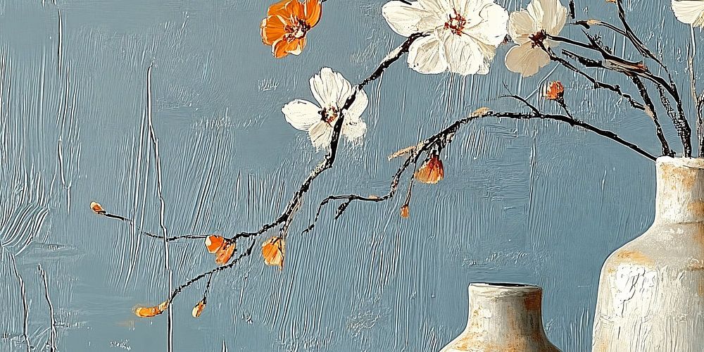 Cette œuvre montre un arrangement de branches fleuries orange et blanches dans des vases en céramique sur un fond bleu patiné. La composition célèbre la beauté de la nature et l’élégance tranquille d’objets simples dans un jeu harmonieux de couleurs, de formes et de textures.