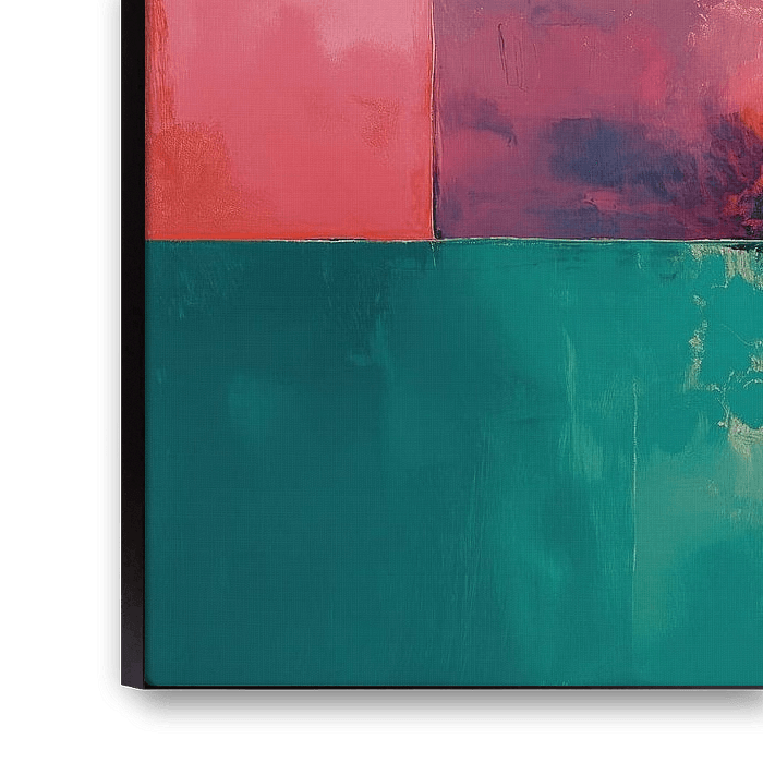 Une œuvre d'art abstraite moderne qui joue avec les tons chauds et froids dans une composition géométrique. Les teintes turquoise et turquoise contrastent magnifiquement avec les touches chaudes d'orange et de rose, tandis que des touches crème douces équilibrent l'ensemble. La composition en couches et les subtiles transitions de couleurs créent une impression de profondeur et de mouvement, évoquant un paysage méditerranéen stylisé.