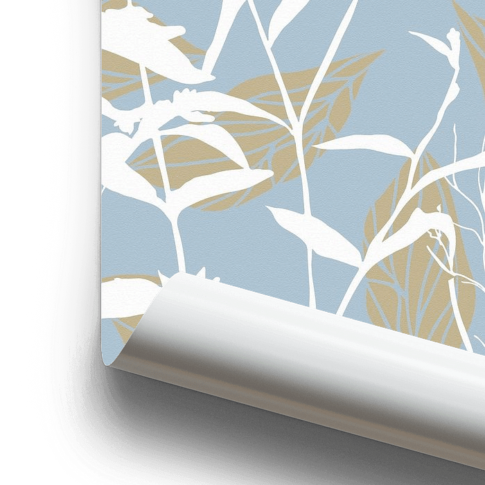 Achetez cette œuvre d'art florale Botanica Delicata. Fleurs et feuilles rétro abstraites en bleu, blanc et or foncé. par Dina Dankers sur toile, aluminium, ArtFrame ou photographie (encadrée), impression d'art en haute qualité et tout format.