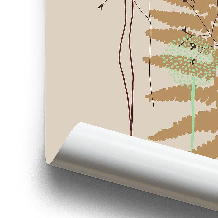 Illustration botanique moderne avec des feuilles de fougères, des fleurs stylisées et des graminées dans une palette de couleurs neutres et rétro.