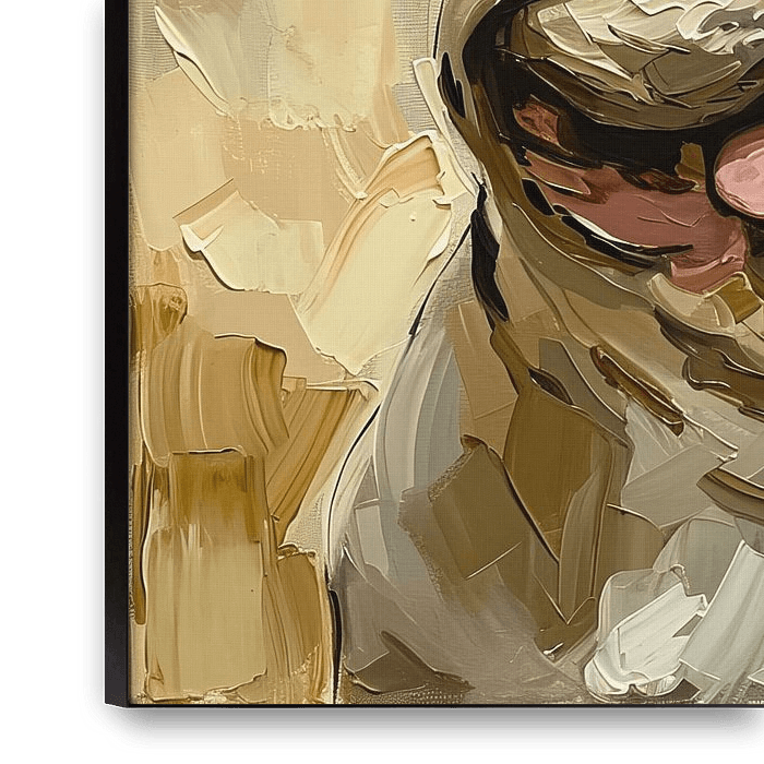Bouledogue à la langue - Ce portrait vibrant d'un bouledogue, exécuté avec des coups de pinceau épais et expressifs, crée une texture presque tangible qui souligne la force et la présence du chien. Les tons beiges et bruns, combinés avec les reflets et les ombres, donnent à la peinture un aspect chaleureux, tandis que l'air joyeux du bouledogue ajoute un élément ludique à n'importe quelle pièce.