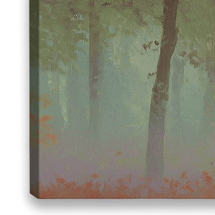 Kijkend naar het werk zie je hoe het gras en de bladeren aan de randen een fijn, stip-achtig ritme vormen, alsof de penseelstreek een fluistering is. Het pad zelf is breed en zacht van toon, een warme neutrale baan die naar het licht leidt; langs de randen vlamt herfstkleur op in kleine accenten. De bomen schilderen verticale lijnen — donker, robuust, met ruwe structuren — terwijl de mist horizontaal en diffuus werkt. Dit schilderij van bomen en mist gebruikt gelaagde verflagen: transparante glazuren voor de lucht, meer impulsieve vlekken voor de bladeren en een dunnere, bijna droge penseelvoering voor de boomschors; die technieken laten het landschap ademhalen en nodigen uit om langzaam te wandelen in het licht.