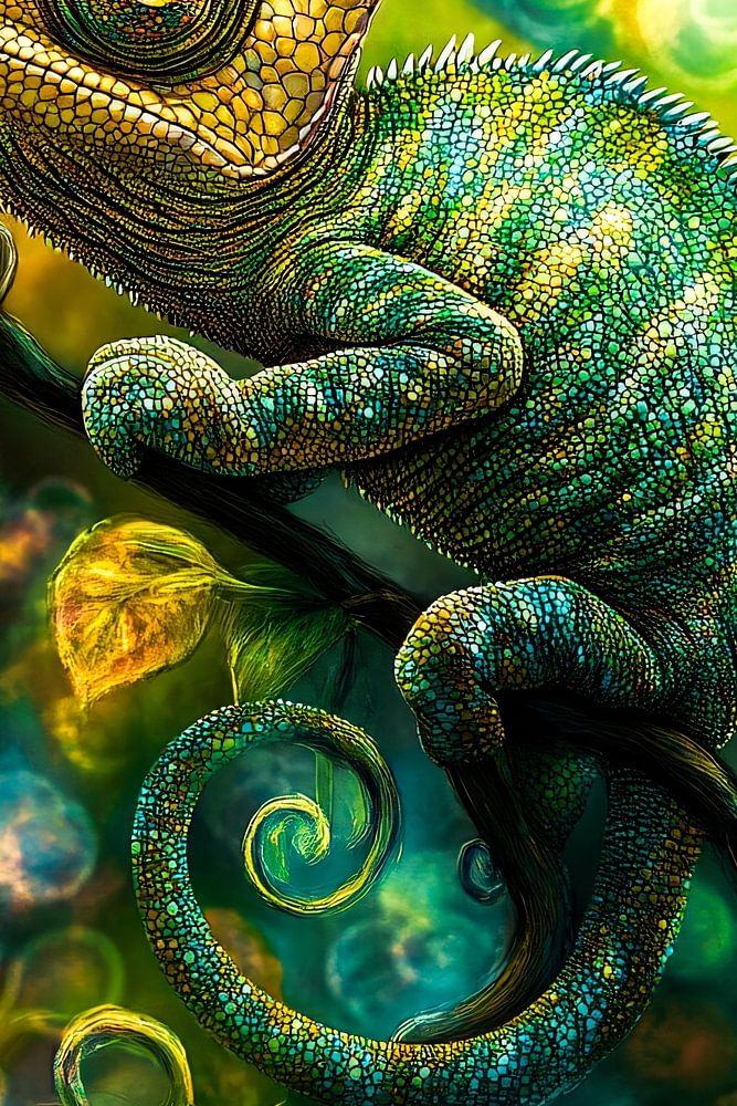 Une image fascinante d'un caméléon assis gracieusement sur une branche, entouré d'une jungle vibrante et colorée. Les détails du caméléon, de ses écailles à sa queue tordue, sont rendus de manière époustouflante dans un style surréaliste. Ce motif apporte non seulement de la couleur à votre espace, mais aussi un sentiment d'exotisme et d'émerveillement. Parfait pour les amoureux de la nature et de l'art. Idéal pour les intérieurs modernes qui ont besoin d'un accent vibrant.