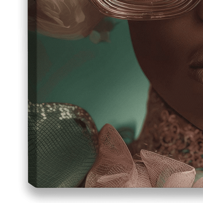 Candy Couture est le portrait glamour d'une jeune fille portant des lunettes XXL et un maquillage rose pailleté de rêve. Ses grandes lunettes carrées à monture dorée captent la lumière, tandis que les boucles rose poudré, le tulle, les fleurs et le petit papillon dans ses cheveux créent un look luxuriant, presque couture. Le gloss doux sur ses lèvres et le fond vert menthe complètent le tableau - comme si vous regardiez un éditorial de mode haut de gamme.