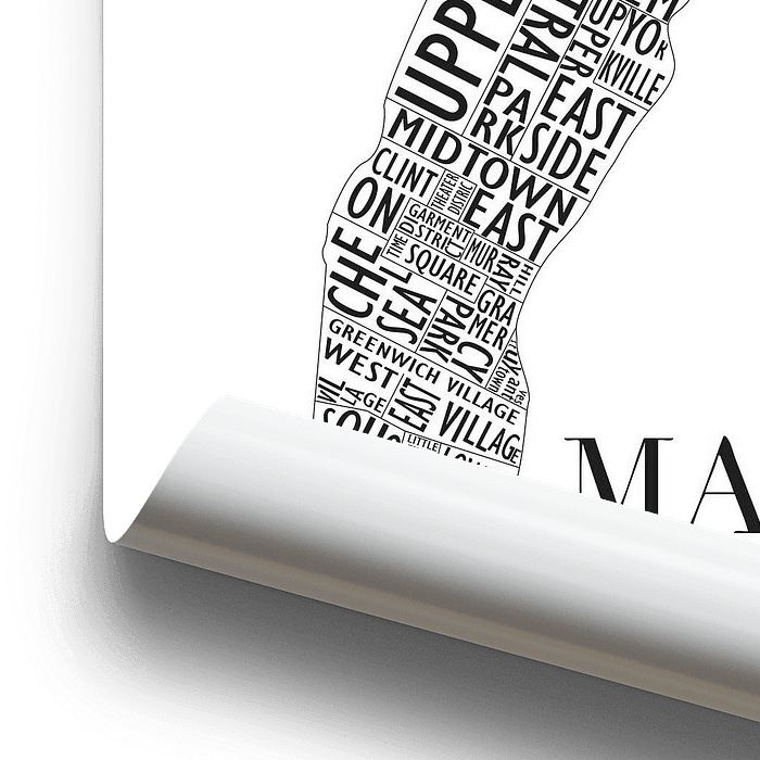 Achetez cette œuvre d'art abstraite Carte de Manhattan en mots par Muurbabbels Typographic Design sur toile, aluminium, ArtFrame ou photographie (encadrée), impression d'art en haute qualité et tout format.