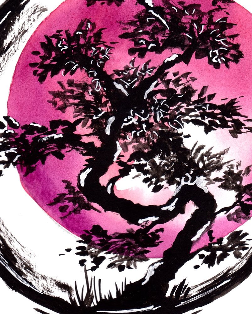 Aquarelle et encre représentant un bonsaï japonais poussant dans un cercle Enso avec un grand soleil rouge en arrière-plan.