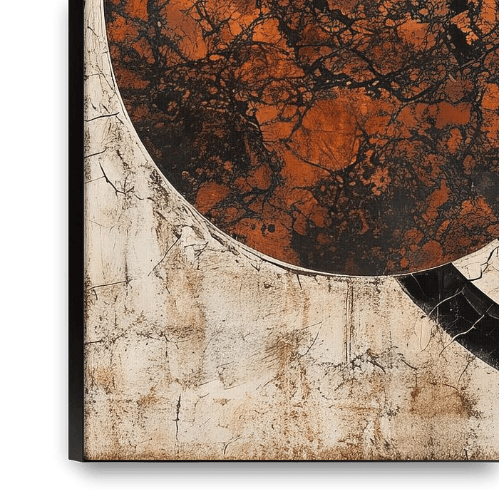 Cercles abstraits | Cercle orange - Avec un équilibre réfléchi entre abstraction et géométrie, cette œuvre d'art captive immédiatement l'observateur grâce à son cercle orange central et texturé sur un fond de cercles concentriques noirs et blancs. La texture craquelée et l'arrière-plan de couleur terre confèrent un charme usé, parfait…