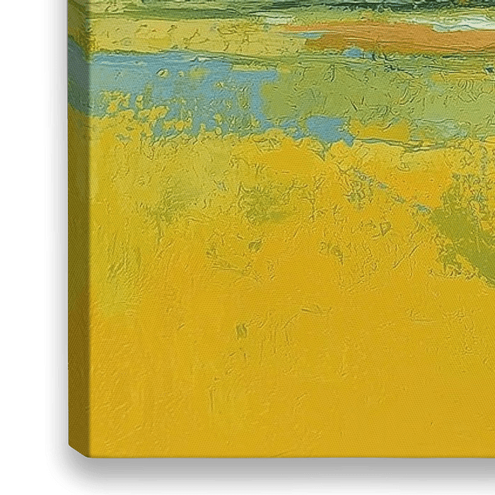 Geel Veld - Dit is een zonnig veld schilderij waarin het gele weidse vlak meteen naar je toe komt — een bijna tastbare laag citroengeel die het hele voorgrondveld beslaat. De verf ligt dik en geborsteld, met vlekken en spatten waar het geel overloopt in koele blauwtinten en saliegroen; alsof het licht letterlijk op het gras ligt en je kunt voelen hoe de zon heen en weer glijdt over de akker. In het midden en naar rechts toe vormt een rij smalle bomen een ritmische onderbreking: slanke, donkere stammen als dunne lijnen in het landschap, bladeren opgebouwd uit stipjes en korte toetsen die tegelijk suggestie en structuur geven. Noem het een veld schilderij met een accent op bomen — het is duidelijk waar de kunstenaar zijn aandacht legde, en waarom.