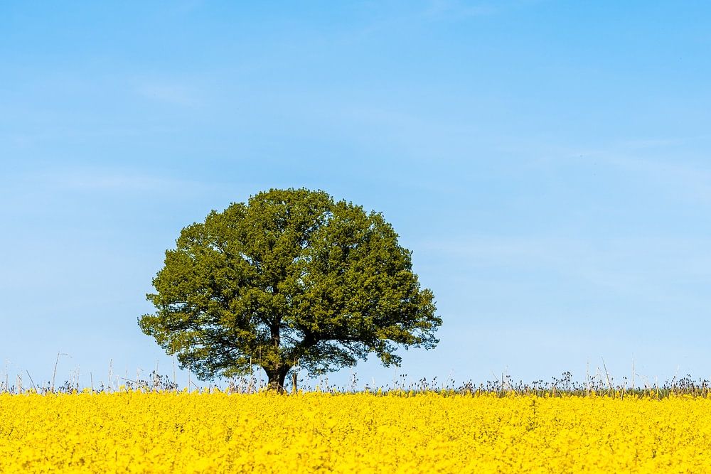 Colza en fleurs au chêne de la paix au printemps près de Hombressen, Hofgeismar dans le district de Kassel, Hesse, Allemagne.
