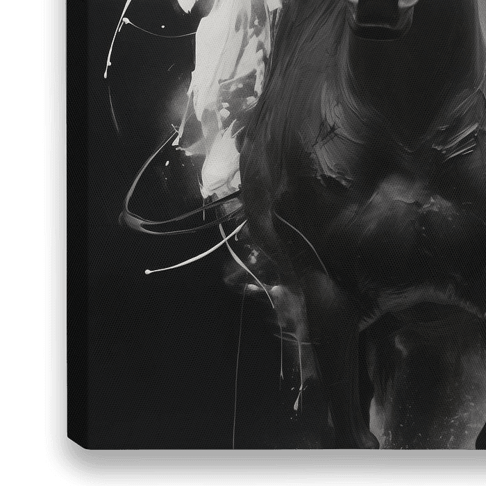 Cette œuvre d'art est une représentation abstraite d'un cheval noir qui semble se détacher avec force. Le style de la peinture est expressif et dynamique, avec des éclaboussures de peinture blanche et noire qui semblent danser autour du cheval comme une explosion d'émotion énergique.