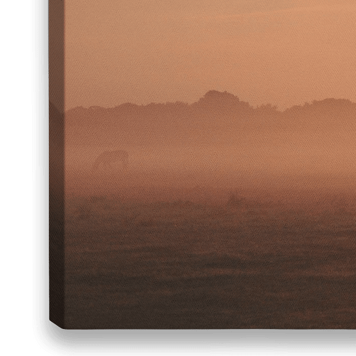 Trois chevaux dans la brume et le brouillard au lever du soleil. La belle lumière du matin fait ressortir la silhouette de ces chevaux dans la brume qui plane sur le champ.