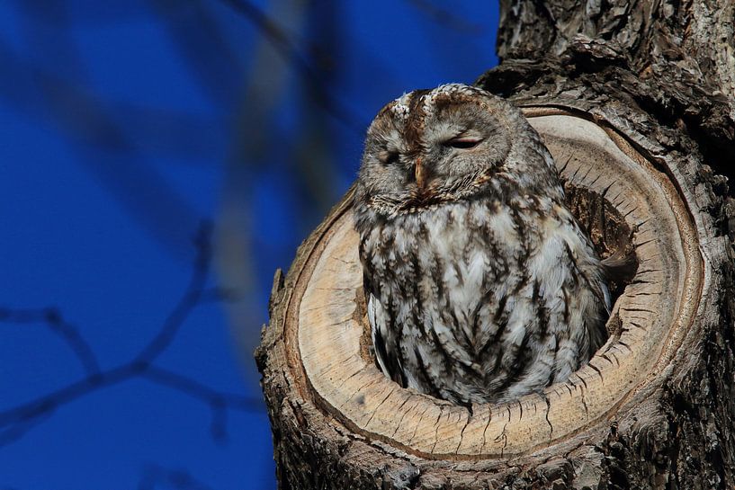 Chevêche d'Athéna (Strix aluco) dans un tronc d'arbre creux Allemagne par Frank Fichtmüller