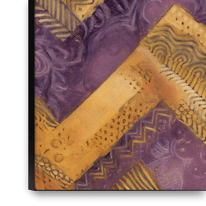 Cette œuvre présente un motif chevron vibrant avec une palette de tons dorés et violets. Les formes en zigzag sont remplies de divers motifs géométriques et textures, allant de lignes ondulées à des points et des rayures, qui confèrent au motif un aspect riche et stratifié.