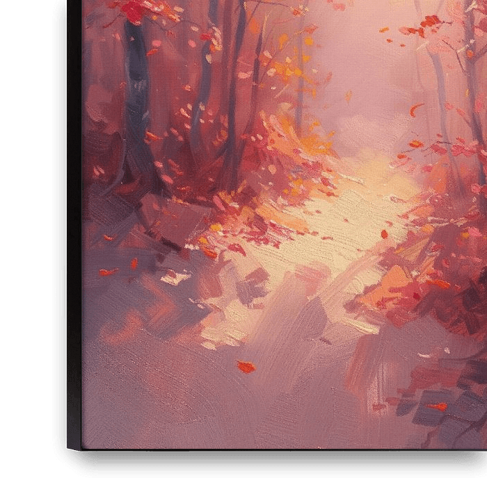 La forêt enveloppée d'un manteau de teintes automnales, un chemin bordé d'arbres qui laissent tomber leurs feuilles comme des noix colorées. Le soleil joue à cache-cache entre les branches, emplissant la scène d'une douce et chaude lueur. Cette œuvre est une invitation à sentir les feuilles fraîches crisser sous vos pieds et à respirer…