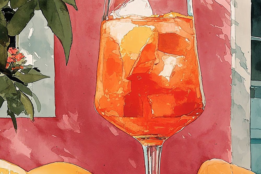 Une scène méditerranéenne ensoleillée met en scène un cocktail d'oranges rafraîchissant sur un mur rose avec un cadre de fenêtre turquoise. Des oranges fraîches trônent au premier plan, tandis qu'un oranger luxuriant aux fruits mûrs encadre la composition. L'œuvre dégage une ambiance chaleureuse et méridionale, avec un style moderne et illustratif.