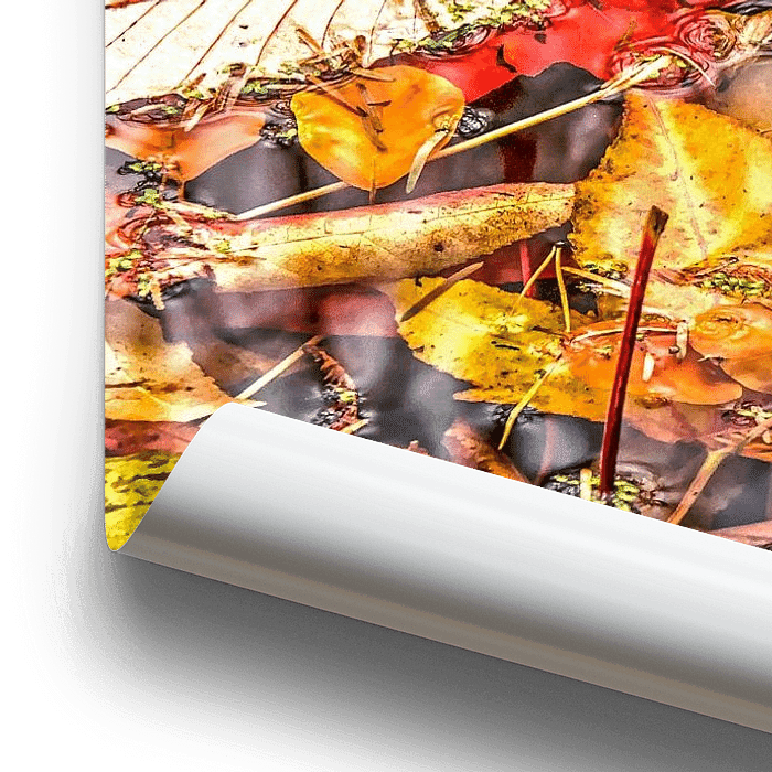 flottant dans un étang, former un collage coloré d'automne avec beaucoup de couleurs rouges, brunes et jaunes et quelques accents verts.