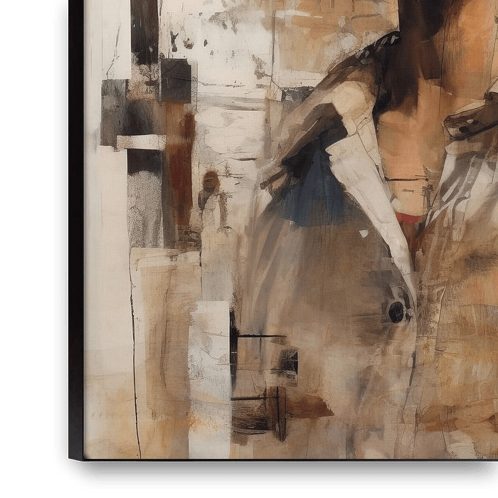 Collage numérique moderne : portrait d'une jeune femme dans des tons de terre et des touches de rouge, de bleu, de jaune et de vert. C'est une belle œuvre pour votre mur ! Très cool en grand format sur artframe ! ;-)