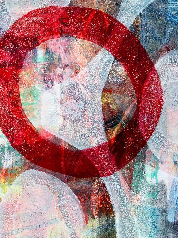 Ce monotype ou monoprint est réalisé avec une gélatine et de la peinture acrylique. Il s'agit d'une pièce unique, faite à la main, qui ne peut être imprimée qu'une seule fois. La technique d'impression graphique et le papier utilisé créent toutes sortes de structures et d'effets. En particulier dans le blanc au centre, les structures ressemblent à une photographie aérienne d'un delta de rivière. Ici, de nombreuses couches ont été imprimées l'une sur l'autre, avec des gabarits faits maison entre les deux. En conséquence, il semble y avoir une certaine profondeur dans le travail. Les formes rondes s'imbriquent comme les maillons d'une chaîne et symbolisent le lien entre tous les êtres humains. Une bague relie également deux personnes dans un mariage ou une relation.