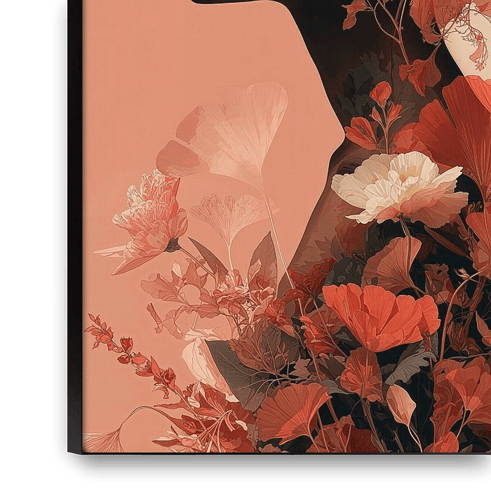 Une œuvre numérique fascinante qui métamorphose un profil féminin en une luxuriante cascade de fleurs. L'expression sereine du visage contraste avec la profusion de fleurs roses et rouges qui ornent sa tête et ses épaules. Cette œuvre hybride explore les thèmes de l'épanouissement intérieur, de la féminité et de l'imbrication de…